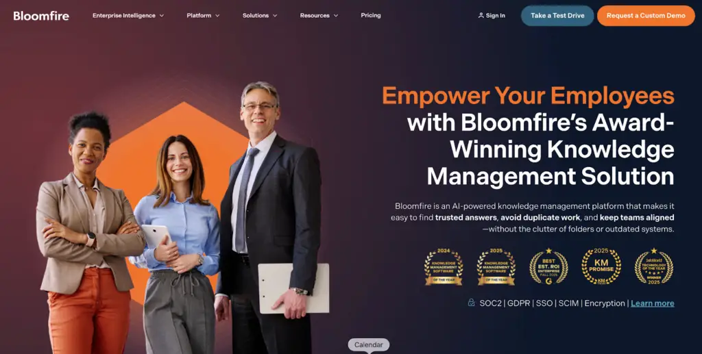 Bloomfire is an AI-powered knowledge management platform that centralizes company knowledge and makes it discoverable through advanced search. It positions itself as an enterprise intelligence platform that goes beyond static document storage.