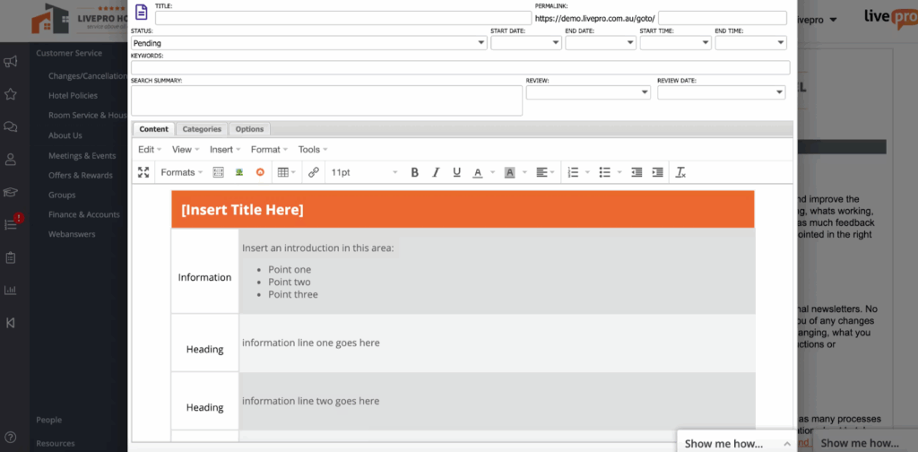 To keep knowledge controlled and compliant, livepro includes a set of governance tools that manage content from creation to retirement: