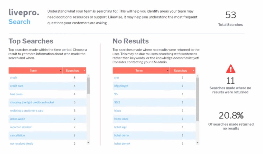 To support ongoing improvement, livepro surfaces search patterns, article performance, and agent feedback so you know what to fix.