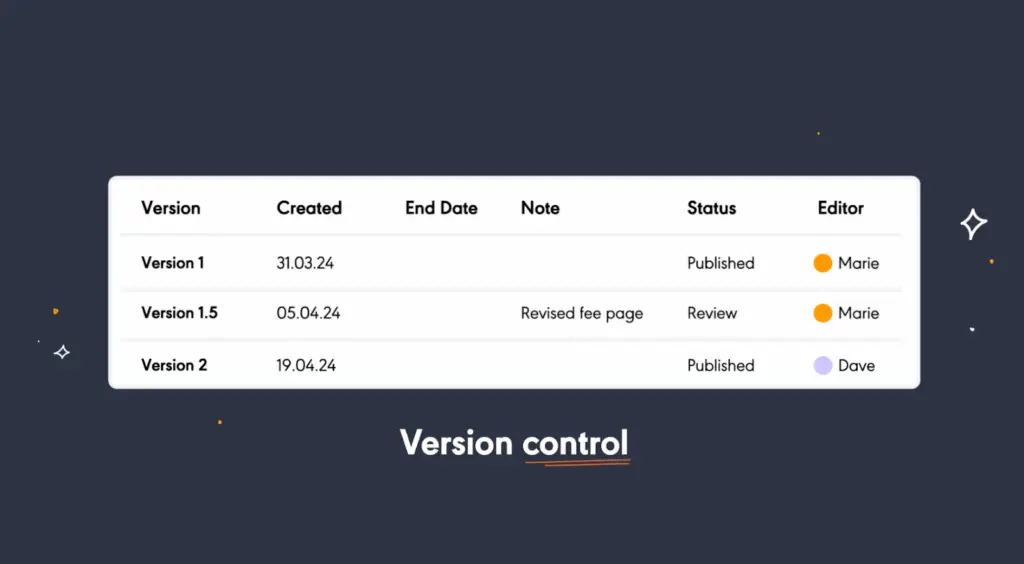 - Version control and visual comparison to track changes, see who updated what, and restore previous versions if needed