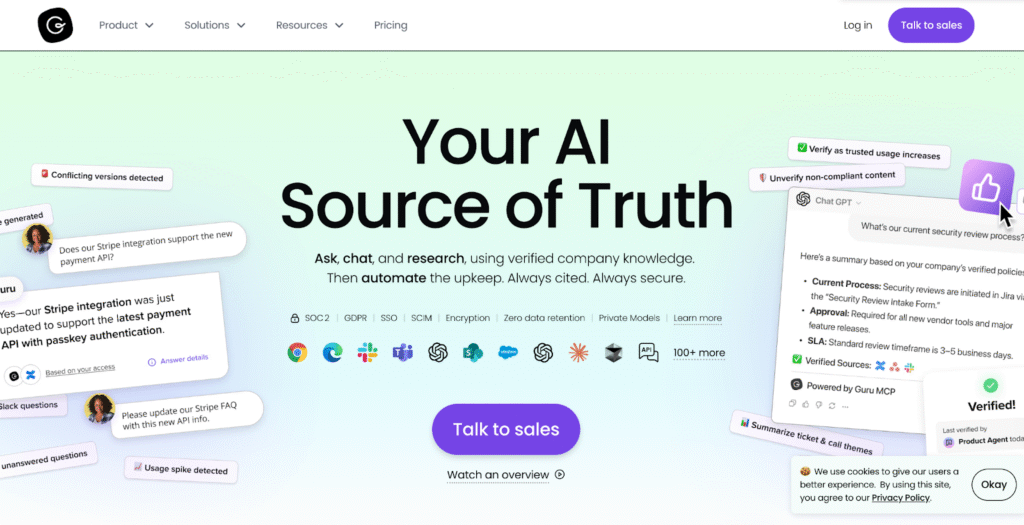 Guru suits sales teams, customer support, and distributed organizations that need instant access to verified information across multiple tools.
