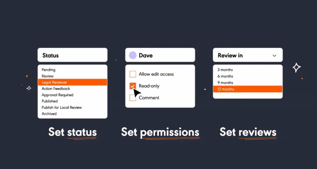 - Automated review date reminders, prompting owners to review content at set intervals