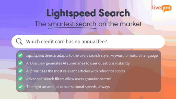 livepro’s Hybrid Lightspeed Search uses NLP and vector search to understand intent and return the exact answer, even when queries include typos or vague phrasing.