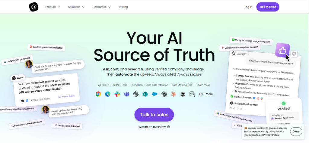 Guru focuses on delivering knowledge directly inside tools like Slack, Microsoft Teams, and browser extensions. It helps internal teams access verified information without leaving the tools they already use.