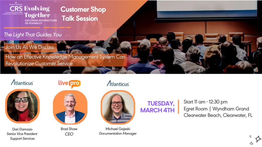 Join Gold Sponsor livepro CEO – Brad Shaw, Atlanticus SVP of Support Services – Dari Damazo, and Documentation Manager – Michael Gajeski as they reveal how livepro’s AI-powered Knowledge Management has helped Atlanticus enhance customer experience (CX), empower agents, and drive efficiency.