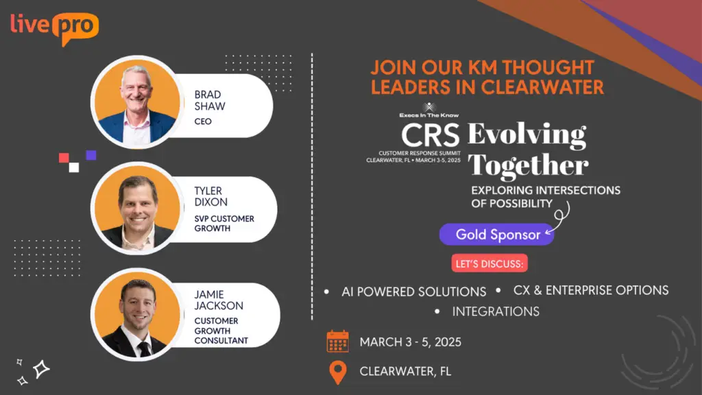 AI-Powered CX Solutions at EITK! Meet livepro’s Brad Shaw, Tyler Dixon & Jamie Jackson at the Customer Response Summit in Clearwater, FL, to explore how AI-driven knowledge management transforms contact center & enterprise operations.
