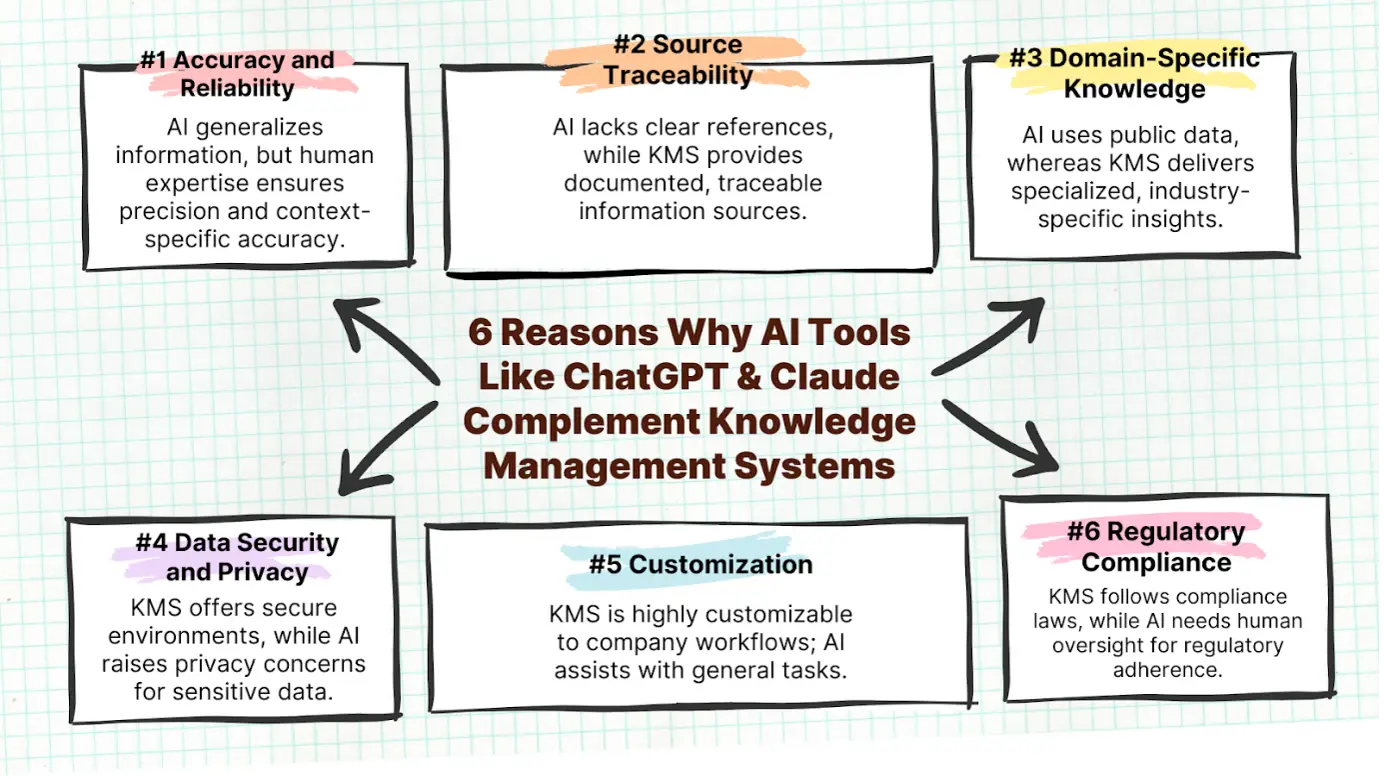 Claude went on to explain why it believed Knowledge Management Systems will play an integral role, and here are the 6 reasons why Claude believes it and ChatGPT need to rely on traditional Knowledge Management systems: